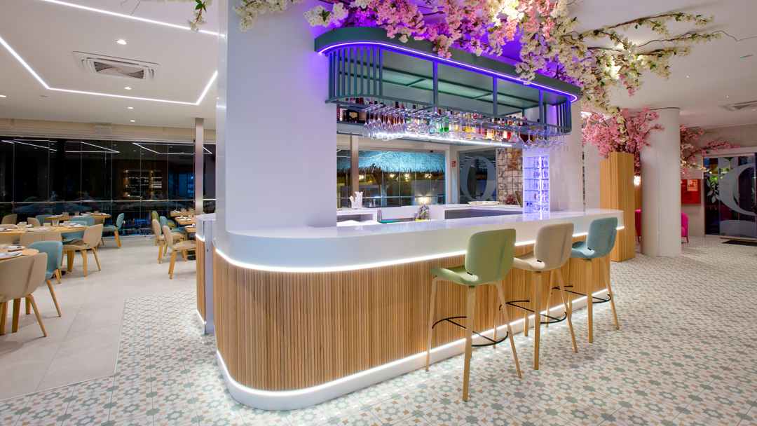 El resultado es un espacio dinámico donde la barra no solo cumple una función práctica, sino que también otorga identidad y protagonismo principal al conjunto.