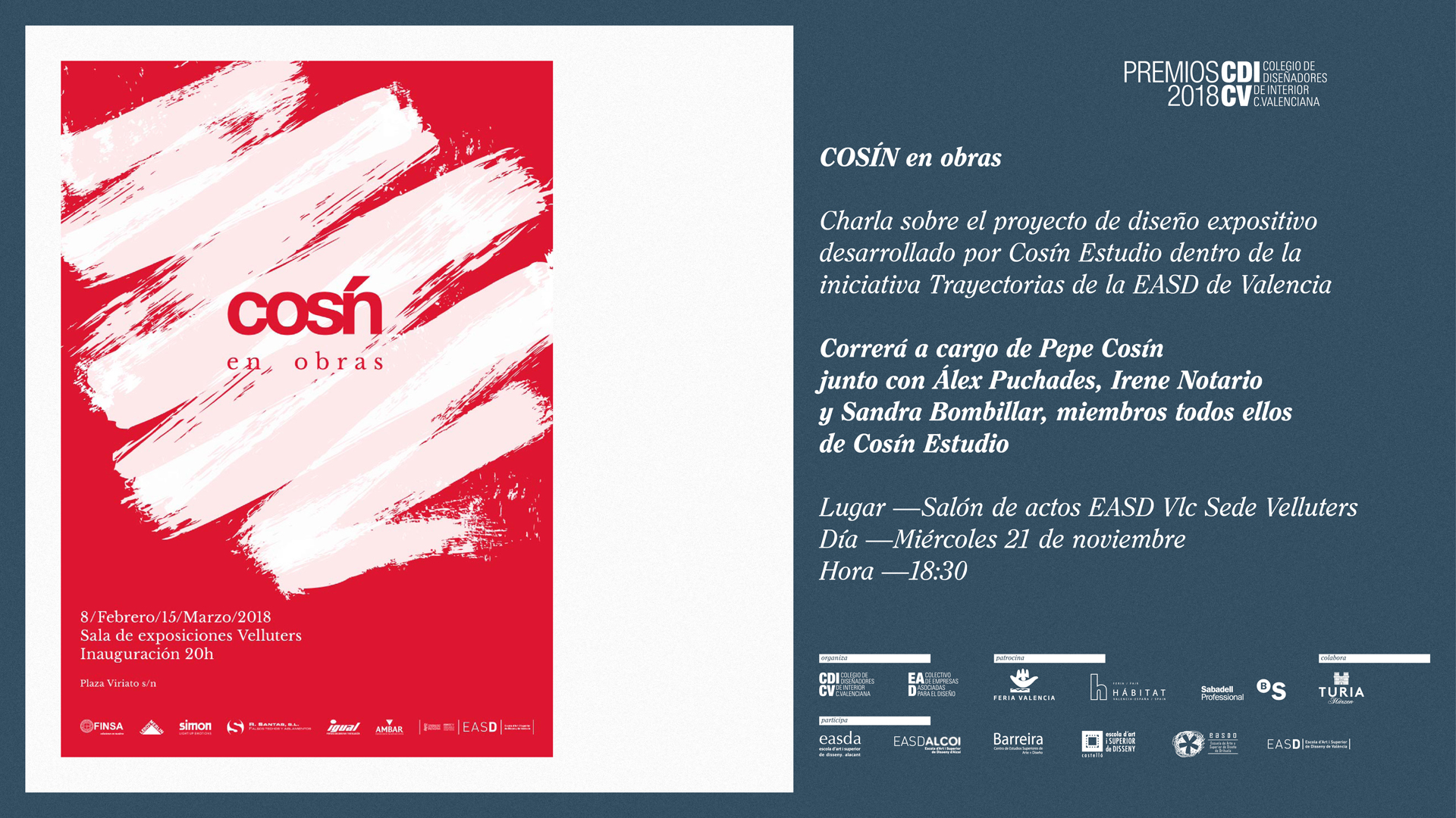 Charla en la que se tratará sobre el diseño del proyecto para la exposición «COSÍN en obras», siendo ésta la primera de una serie de exposiciones titulada TRAYECTORIAS promovida por la EASD. El evento tuvo lugar en el hall de la propia escuela de diseño entre los meses enero, febrero y marzo de 2018. En ella, se recogía una completa muestra de más de 30 años de trabajos profesionales de interiorismo de COSÍN ESTUDIO.