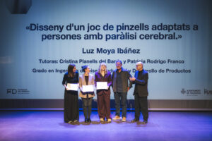 Asimismo, recibió distinción el proyecto «Disseny d’un joc de pinzells adaptats a persones amb paràlisi cerebral», de Luz Moya Ibáñez (Escola Tècnica Superior d’Enginyeria Aeroespacial i Disseny Industrial de la Universitat Politècnica de València), un Trabajo Fin de Grado tutorizado por Cristina Planells del Barrio y Patricia Rodrigo Franco que se basa en el diseño de un sistema de pinceles que mejora la autonomía y la experiencia creativa de personas con parálisis cerebral, demostrando cómo el diseño de producto puede generar impacto social tangible desde la empatía y la investigación aplicada.