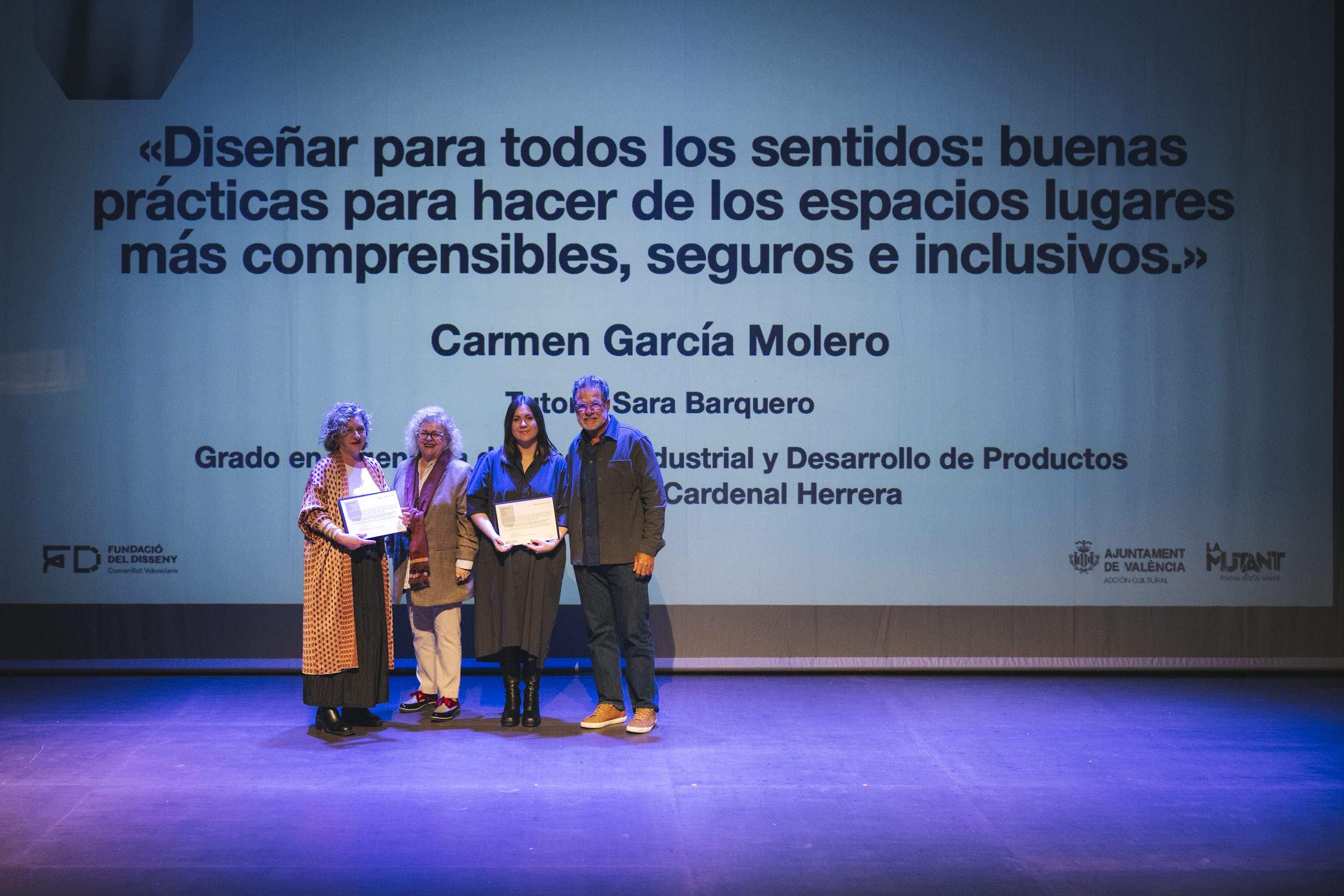 Fue distinguido el Trabajo Fin de Grado «Diseñar para todos los sentidos: buenas prácticas para hacer de los espacios lugares más comprensibles, seguros e inclusivos», de Carmen García Molero tutorizada por Sara Barquero (Universidad CEU Cardenal Herrera), un manual práctico de accesibilidad visual validado por profesionales y usuarios que integra recursos visuales, táctiles y sonoros desde la perspectiva del diseño universal.