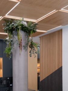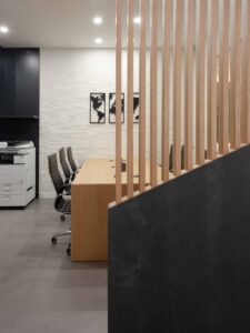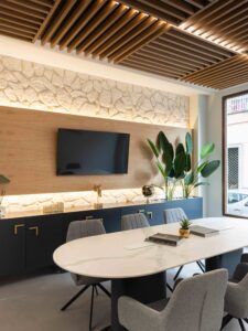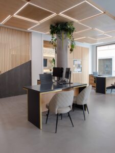 La iluminación indirecta y los techos revestidos en madera, diseñados para integrar y ocultar las instalaciones de climatización, completan el proyecto y generan una atmósfera envolvente y serena. El resultado es un espacio refinado y atemporal, donde diseño y funcionalidad conviven en coherencia con la esencia de la marca.