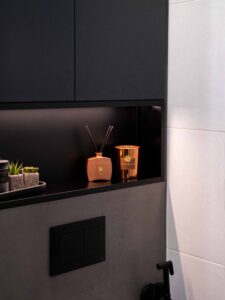 La materialidad define el carácter del espacio: la madera aporta calidez, mientras que la piedra natural, el microcemento y el papel pintado introducen una base sobria y contemporánea. El tono antracita actúa como contrapunto elegante, equilibrando el conjunto.