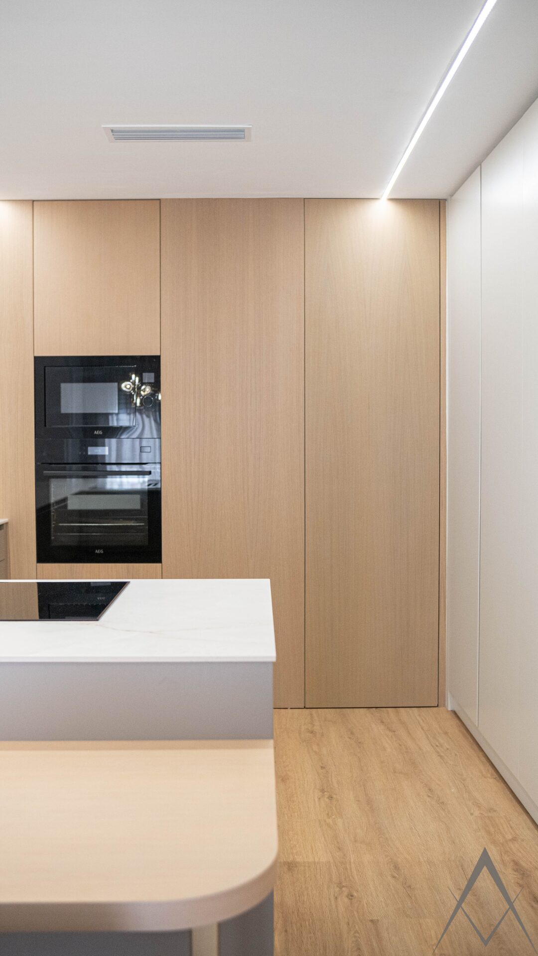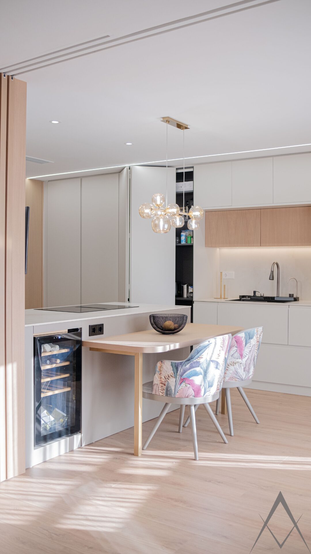 La intervención principal se centra en la cocina, un espacio semiabierto gracias a las puertas correderas que desaparecen dentro de la pared: abiertas, permiten disfrutar de un espacio diáfano y luminoso; cerradas, ofrecen intimidad y orden.