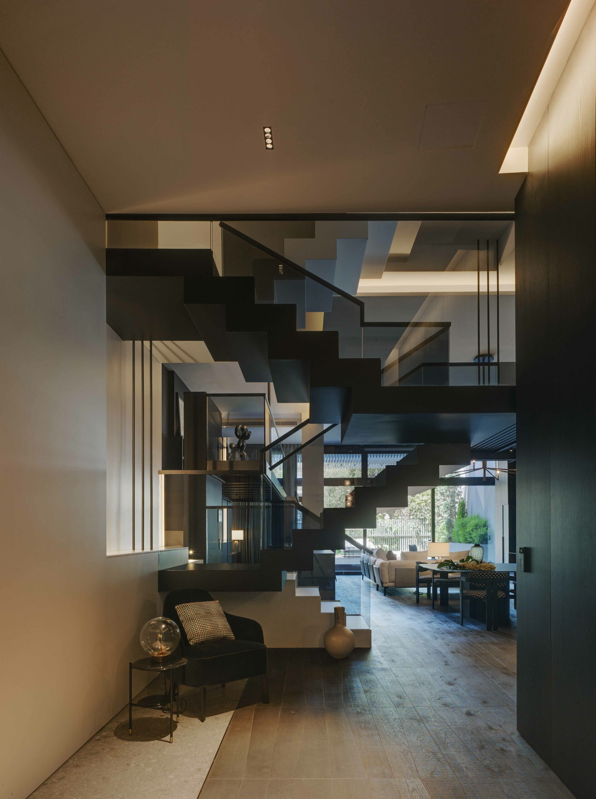 Las puertas de suelo a techo, sensación de altivez y verticalidad, paredes forradas, abrigadas, no están desnudas, diferenciación de niveles mediante una escalera escultórica y arquitectónica diseñada con diferentes planos en el centro de la zona de día, separa visualmente las zonas más nobles (salón, comedor, cocina, porche) de las más funcionales (lavadero y bajada al sótano).