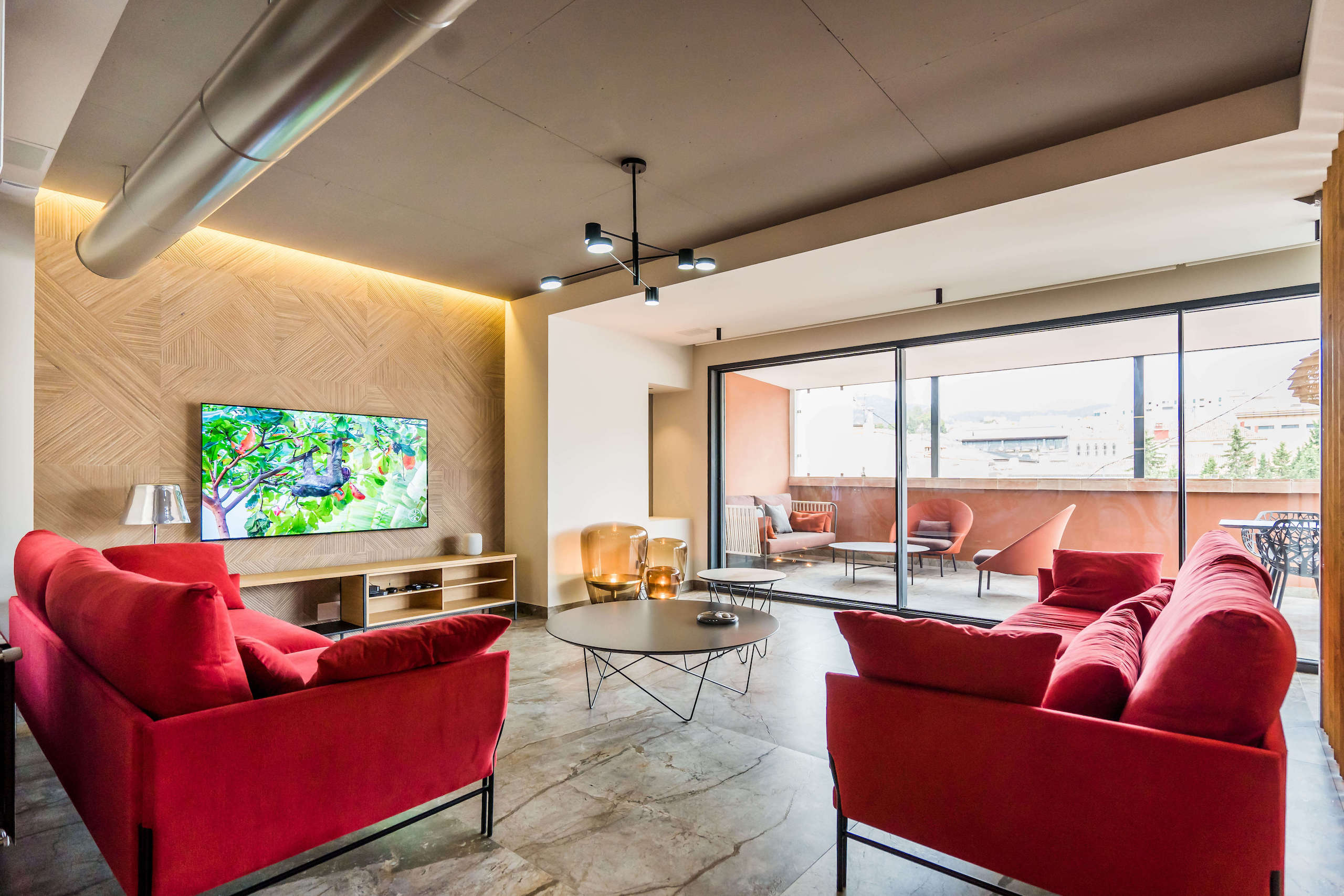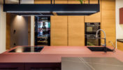 Esta reforma se particulariza por un diseño más atrevido y estilo industrial con tubos de climatización vistos y pintados en gris como parte del diseño completo de la vivienda papeles, colores y contrastes fuertes; creando atmósferas distintas en cada estancia. En la cocina por ejemplo se optó por un color burdeos en los muebles así como en la alfombra y frontal de baldosa hidráulica. Una baldosa que destaca por estar inspirada en la sastrería tradicional inglesa, alejada del diseño clásico del pavimento hidráulico. Todo esto junto al uso de la madera dándole un toque más cálido al conjunto. Para el pavimento se eligió un porcelánico de gran formato amarronado con betas muy marcadas, que se convierte en un elemento destacado de la vivienda.