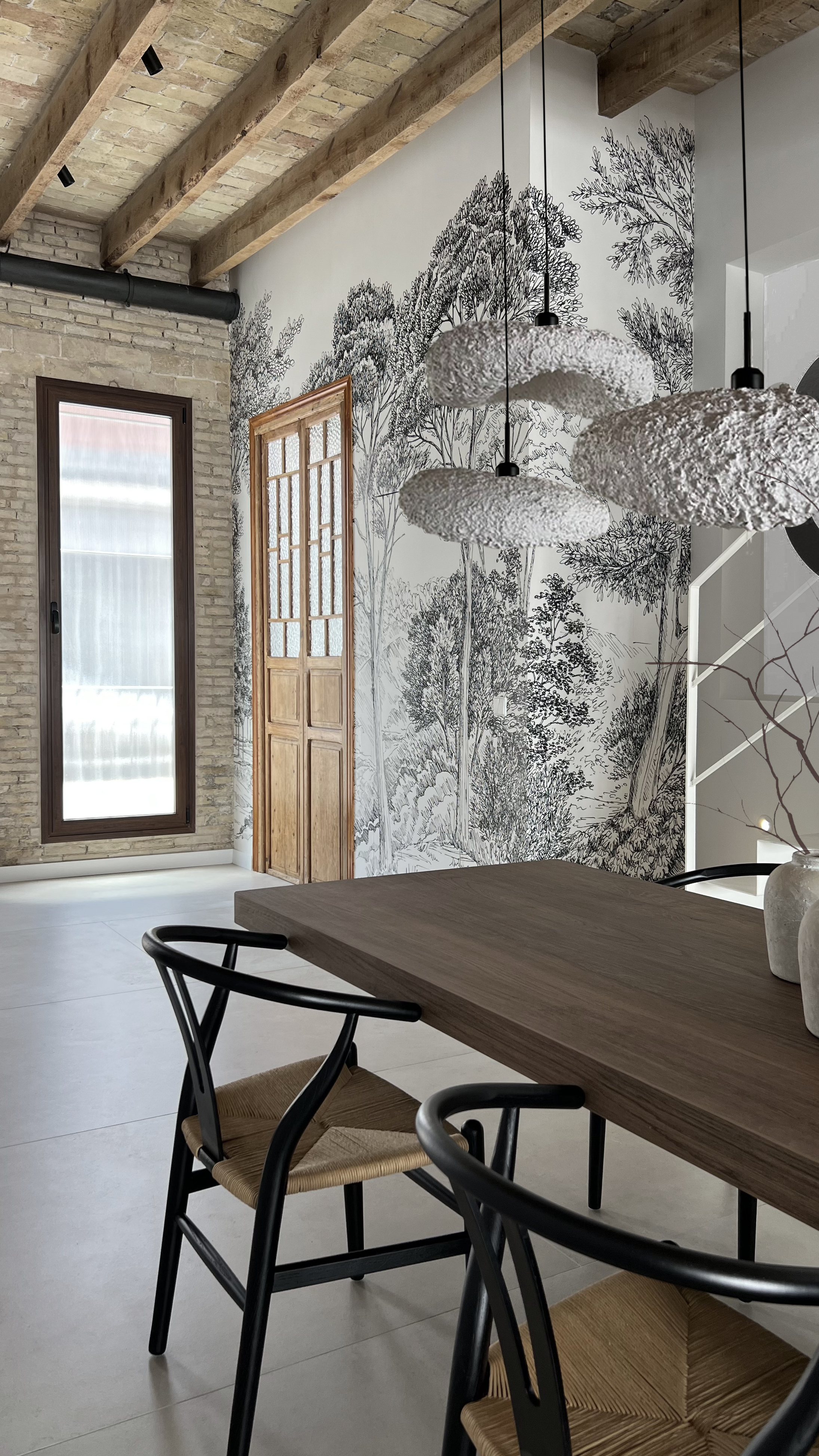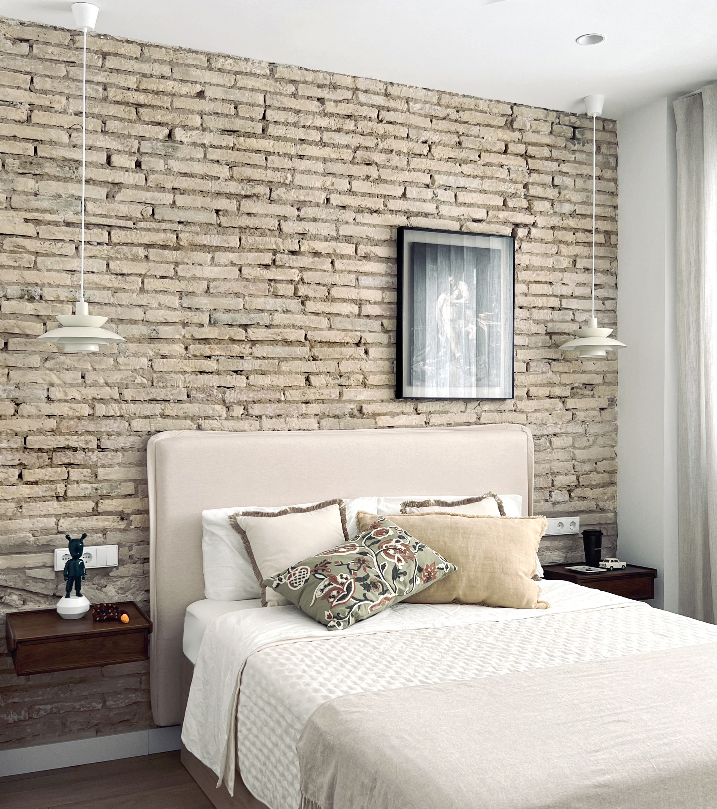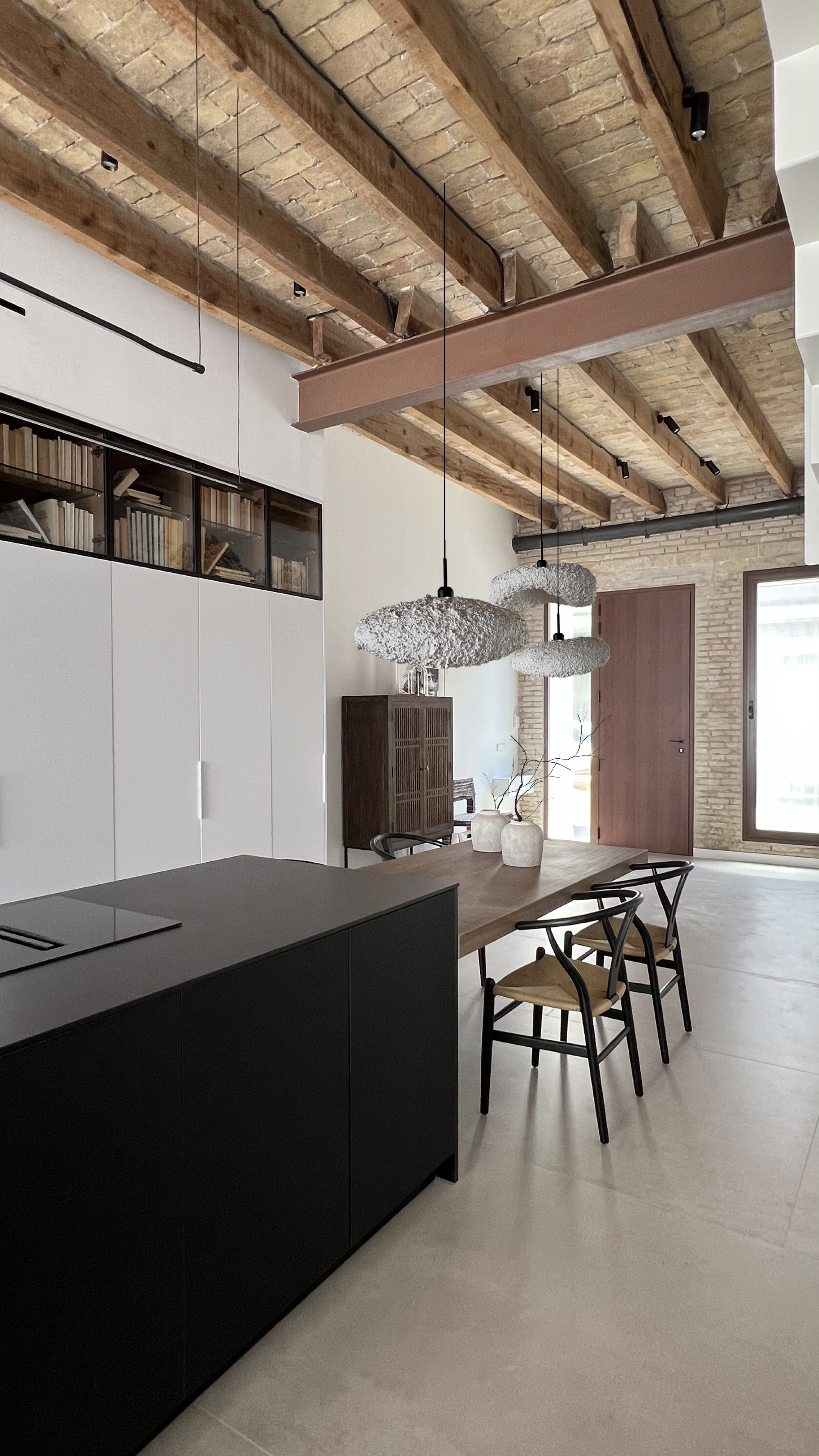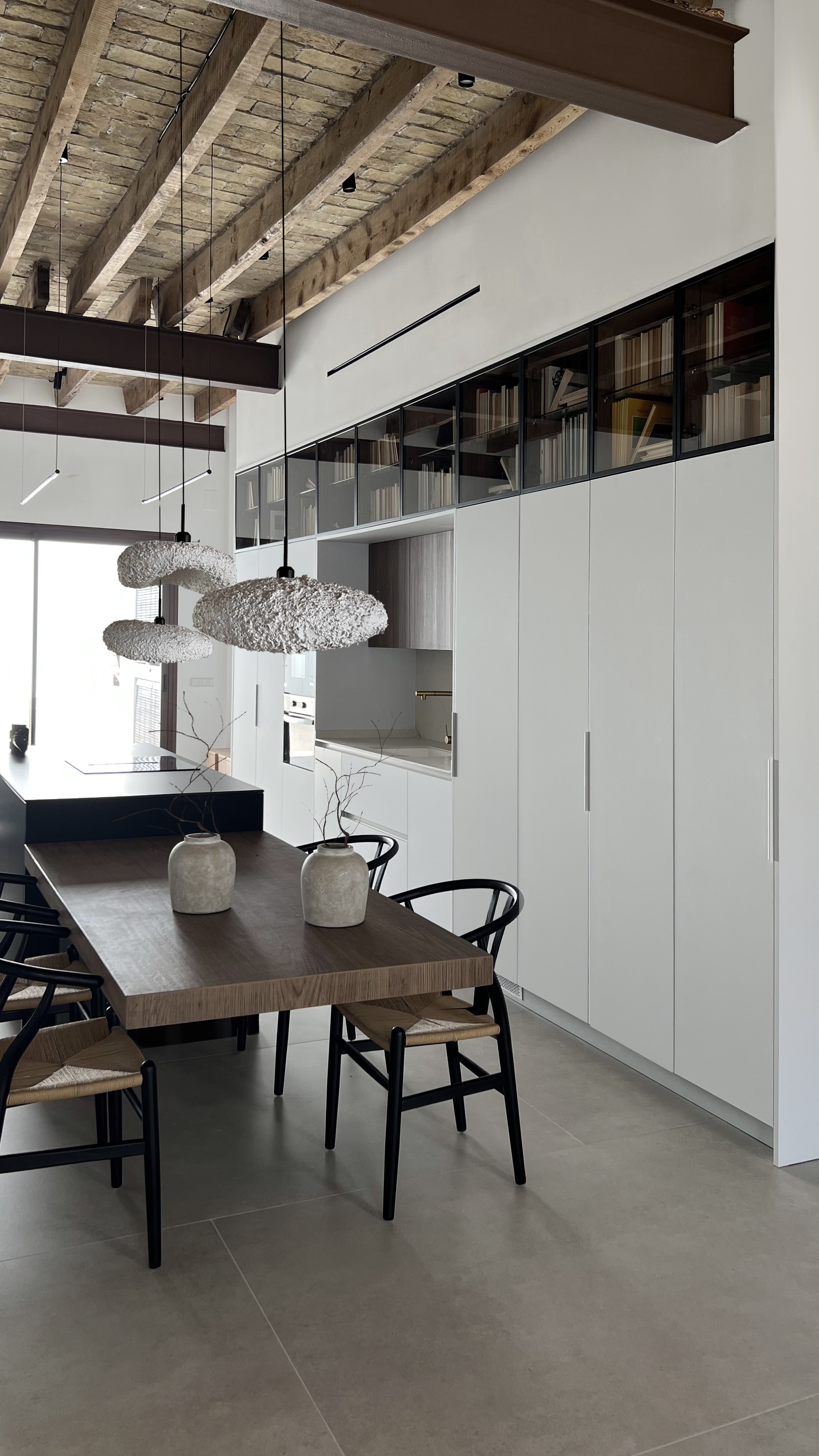 La zona de noche se traslada a la primera planta. Detalles que pasan inadvertidos en un primer instante, como la mesa de la isla sin patas o el suelo técnico del patio, hablan discretamente sobre la calidad del proyecto.