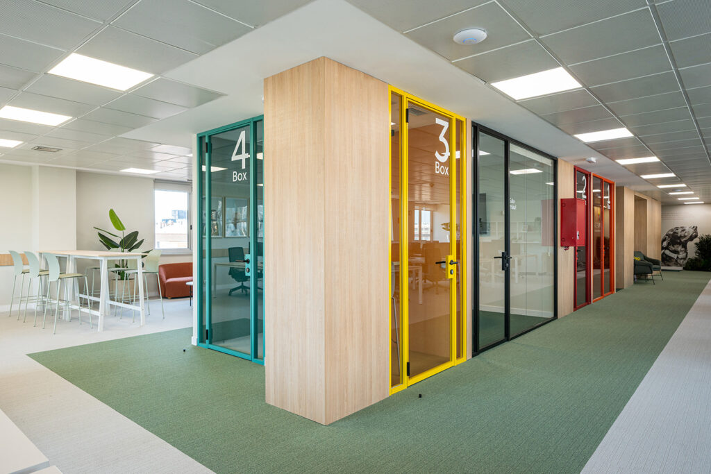 El espacio cuenta con un amplio área de trabajo abierto, un despacho y cuatro salas ágiles, donde la perfilería incorpora los colores corporativos de Unavets, generando un ambiente dinámico y reconocible que invita a la colaboración y la creatividad. La oficina incluye también una sala de espera, decorada con la imagen de un gato que da la bienvenida, transmitiendo cercanía y calidez desde el primer momento.