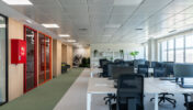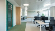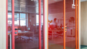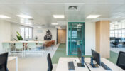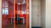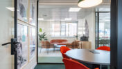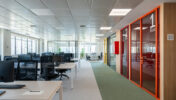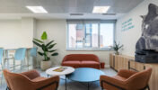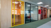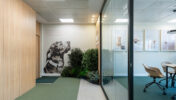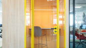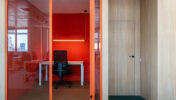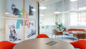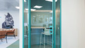 El espacio cuenta con un amplio área de trabajo abierto, un despacho y cuatro salas ágiles, donde la perfilería incorpora los colores corporativos de Unavets, generando un ambiente dinámico y reconocible que invita a la colaboración y la creatividad. La oficina incluye también una sala de espera, decorada con la imagen de un gato que da la bienvenida, transmitiendo cercanía y calidez desde el primer momento.