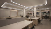 El elemento vertebrador del espacio y que se constituye como protagonista que enlaza una zona con otra es una enorme lámpara de luz led lineal que se va curvando, subiendo y bajando y recorriendo despacho tras despacho en una continuidad.